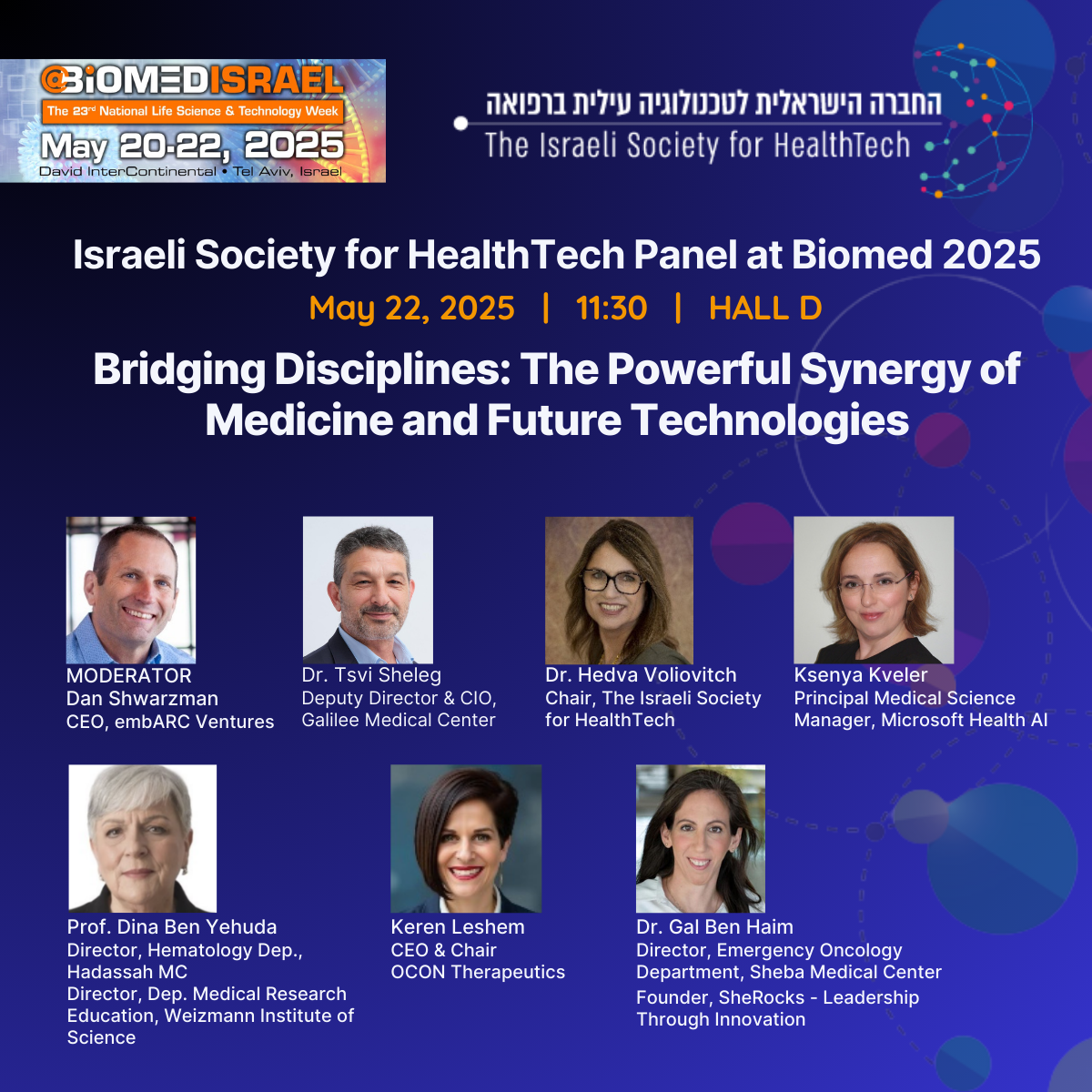 Join this power panel hosted by the Israeli Society for HealthTech at BIOMED 2025! Our panelists will be zooming in on what happens when physicians, tech innovators, and academic leaders join forces. The discussion will revolve around strategy, innovation, and real-world impact - revealing how collaboration drives real solutions to challenges in healthcare.